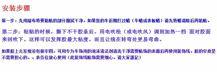 如果胶上去发现没有很牢固。可用专为车饰用的泡沫清洁剂清洗干凈需要贴饰的表面后再使用装饰线。胶的牢度是不需要担心的。。表各位放心使用(此装饰线贴饰需要细心。请大家謹記)
