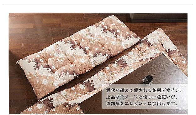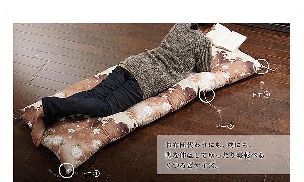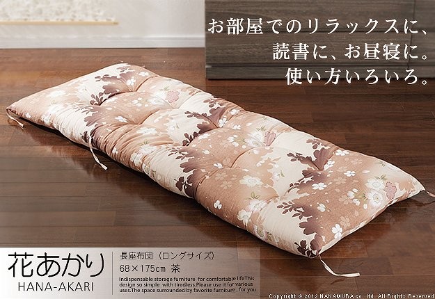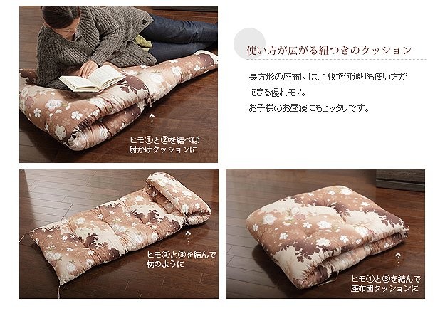 商品について:優しい花のモチーフと色合いが上品な国産のロングサイズ長座布団です。脚を伸ばしてゆったり寝転べるサイズで使い方色々。ヒモ付きなので、ヒモの結ぶ位置を変えれば何通りにも使い方が広がる優れ物です。中綿はたっぷり☆うれしいボリューム感です。お洗濯は専門の業者にご相談ください。
