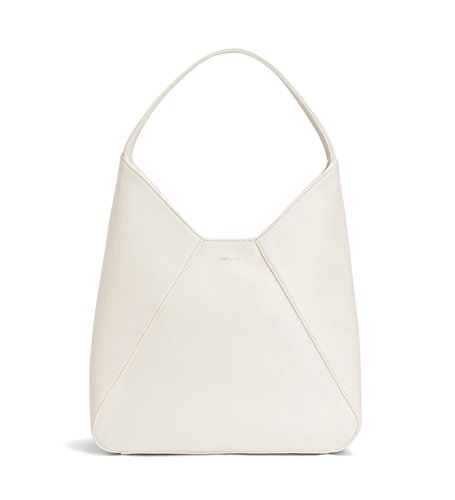 Hobo with magnetic snap closure and single interior compartment. The bag features a singular handle. Interior: zipper pocket, smartphone pocket, logo-embossed Loom tag. 100% recycled nylon lining.