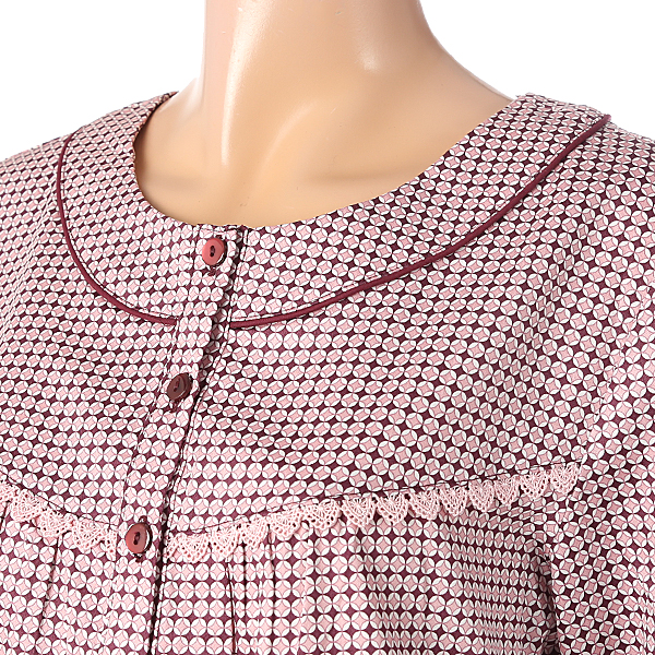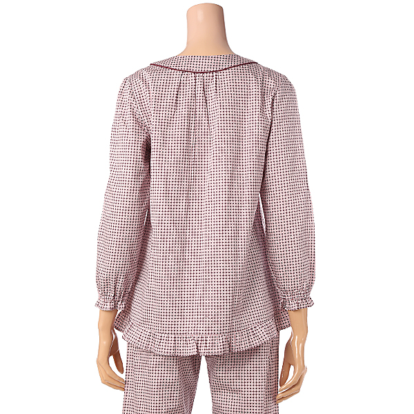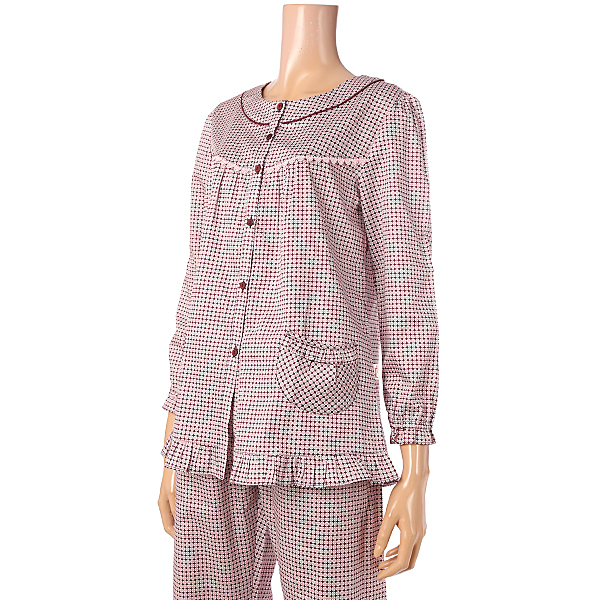 60수 면 100% 여성 파자마입니다. 핑크컬러의 도크스퀘어 패턴으로 디자인되어 있으며 소매와바지밑단부분이 프릴로 되어있어 귀여운 느낌을 줍니다. 남성파자마는 TMJ0768 입니다