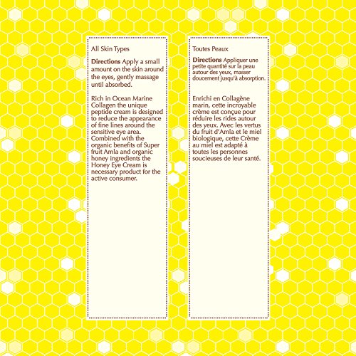 Rich In Ocean Marine Collagen the unique peptide cream in designed to reduce the appearance of fine lines around the sensitive eye area. Combined with the organic benefits of super fruit Amla and organic honey ingredients the Honey Eye cream is the necessary product for the active consumer -- Apply a small amount on the skin around the eyes, gently massage until absorbed.