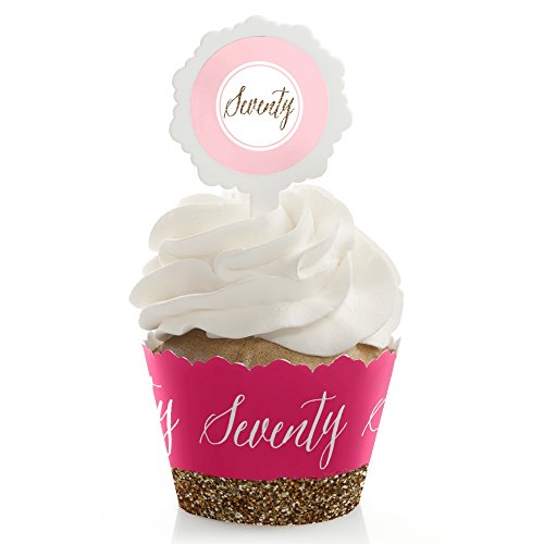 Chic 70th Birthday - Pink and Gold Birthday Cupcake Wrapper & Pick Party Kit - Set of 24