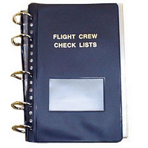 Flexible loose-leaf binder comes with plastic envelopes for insertion of flight checklists. Cover has clear slot to insert a title card. Binder has snap-ring fasteners.