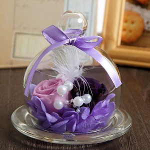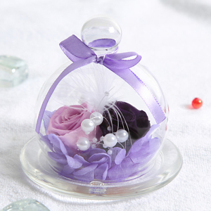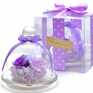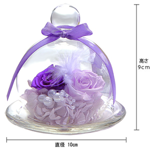 プリザーブドフラワーはホコリが苦手ですが、透明ガラスのドームがお花を守ってくれるので、長い間お花本来の風合いを保ち、色あせることなく輝きます。