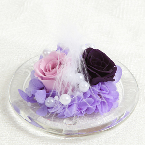 3cm前後の2色のバラのプリザーブドフラワー2輪と紫陽花、パールビーズ、羽根をアレンジしたプリザーブドフラワーガラスドーム入りアレンジメントです。