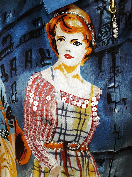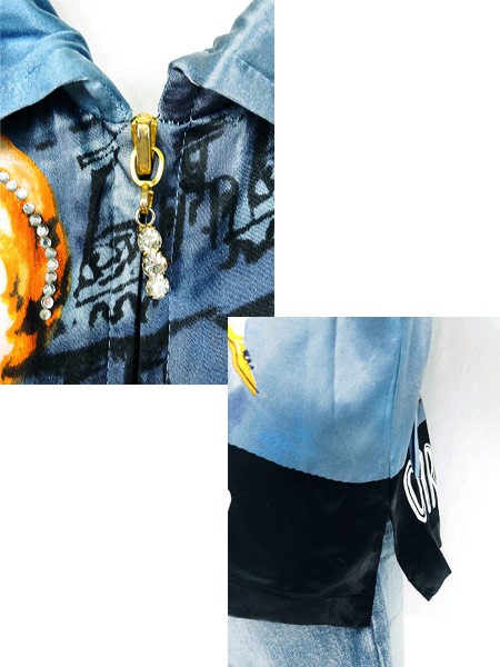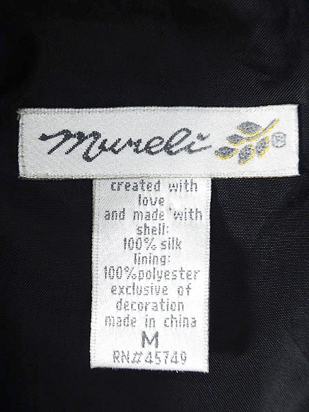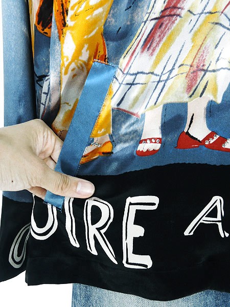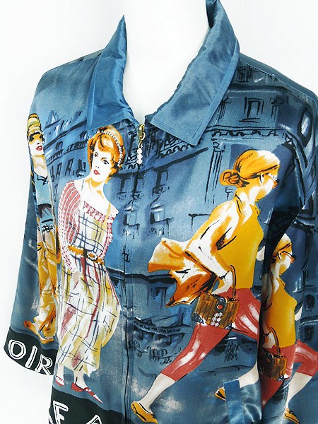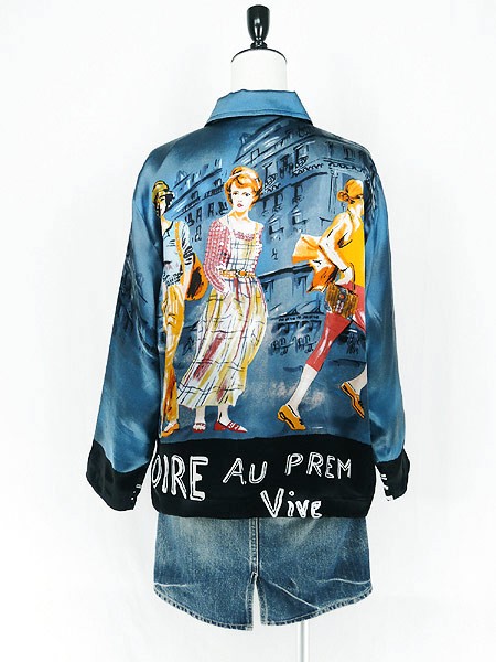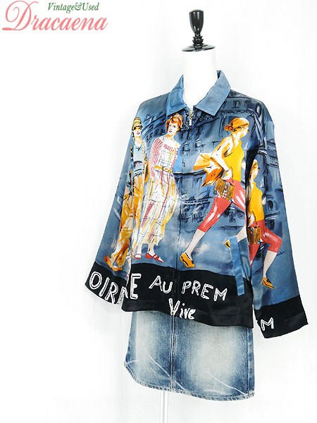 Ladies ブランド- カラーブルーグレーベース・黒・カラフル メール便不可 コンディション★★★ 素材表地シルク・裏地ポリエステル 表記サイズM スタッフコメント裏地付き。左袖口にヨゴレあり。 実寸サイズ 着丈 68 cm 身幅 56 cm 肩幅 44 cm 袖丈 55 cm ※ウエスト・ヒップ以外は平置き採寸