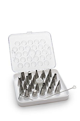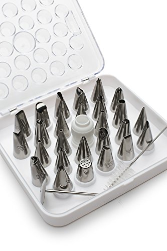 - 32-piece set includes 10” icing bag, 12” icing bag, 26 tips, coupling, tip brush, flower nail