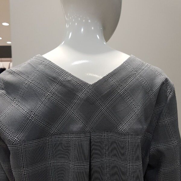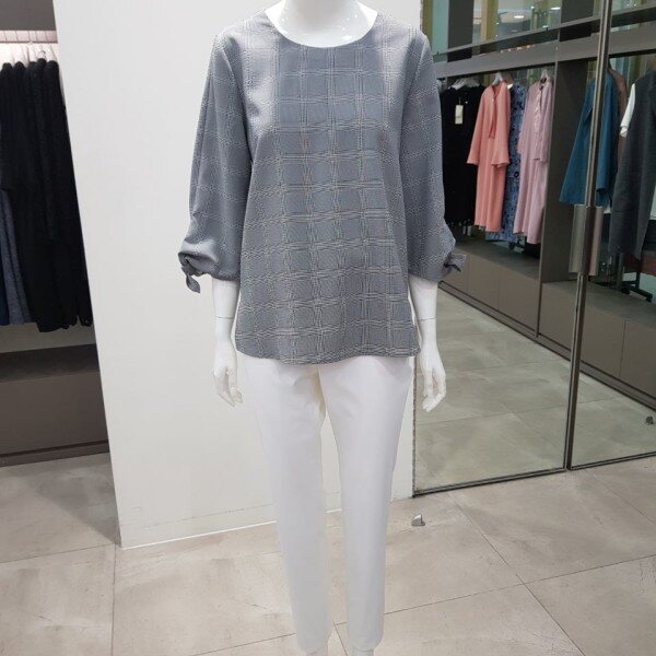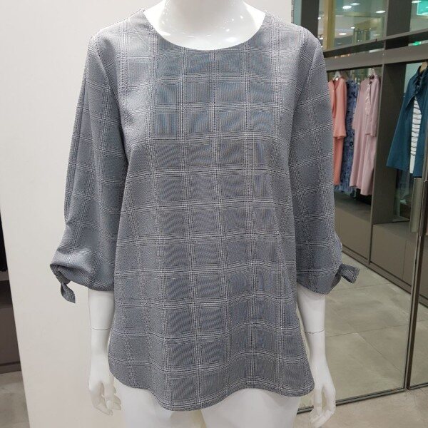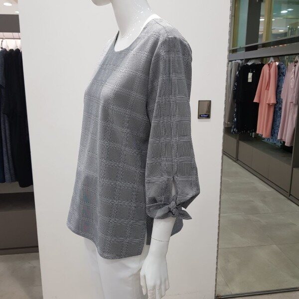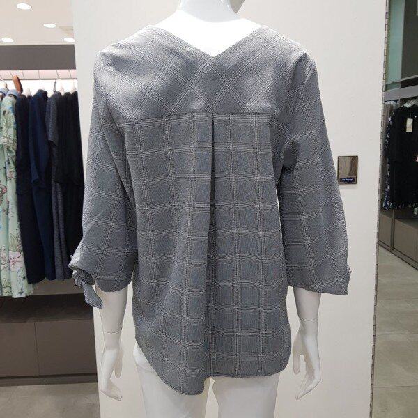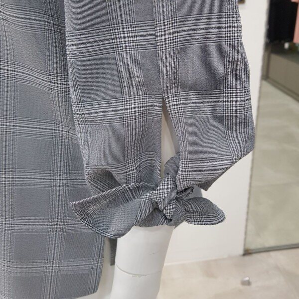 소매리본 7부체크 블라우스로 뒷부분 목라인이 브이넥인 차별화된 디자인