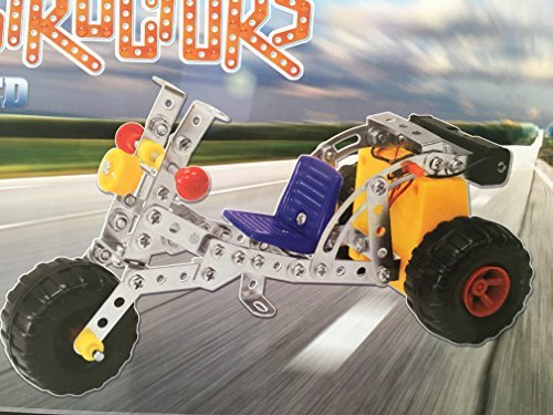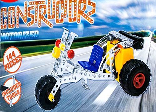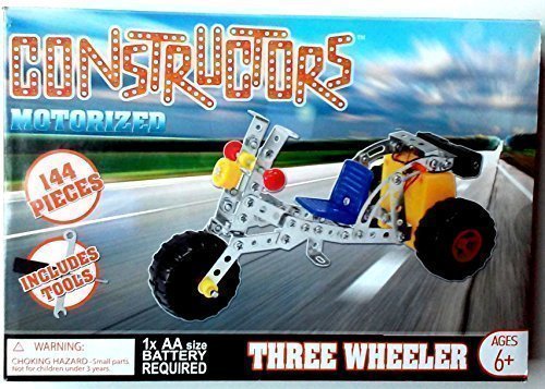 -. Binding : Toy -. Brand : Constructors -. EAN : 0715007537298 -. Feature : Motorcycle Toy Kit - Motorized Three Wheeler Cycle / Motorcycle construction kit includes metal frame pieces, fasteners, and tools / Complimentary Duracell AA Battery to Power the Motorcycle / 144 Pieces / Ages 6 and up -. IsAdultProduct : 0 -. Label : Five Below -. Manufacturer : Five Below -. PackageQuantity : 5 -. ProductGroup : Toy -. ProductTypeName : TOYS_AND_GAMES -. Publisher : Five Below -. Studio : Five Below -. Title : Motorcycle Assembly Kit, Motorized Constructors Three Wheeler Trike Cycle w/ Battery -. UPC : 715007537298