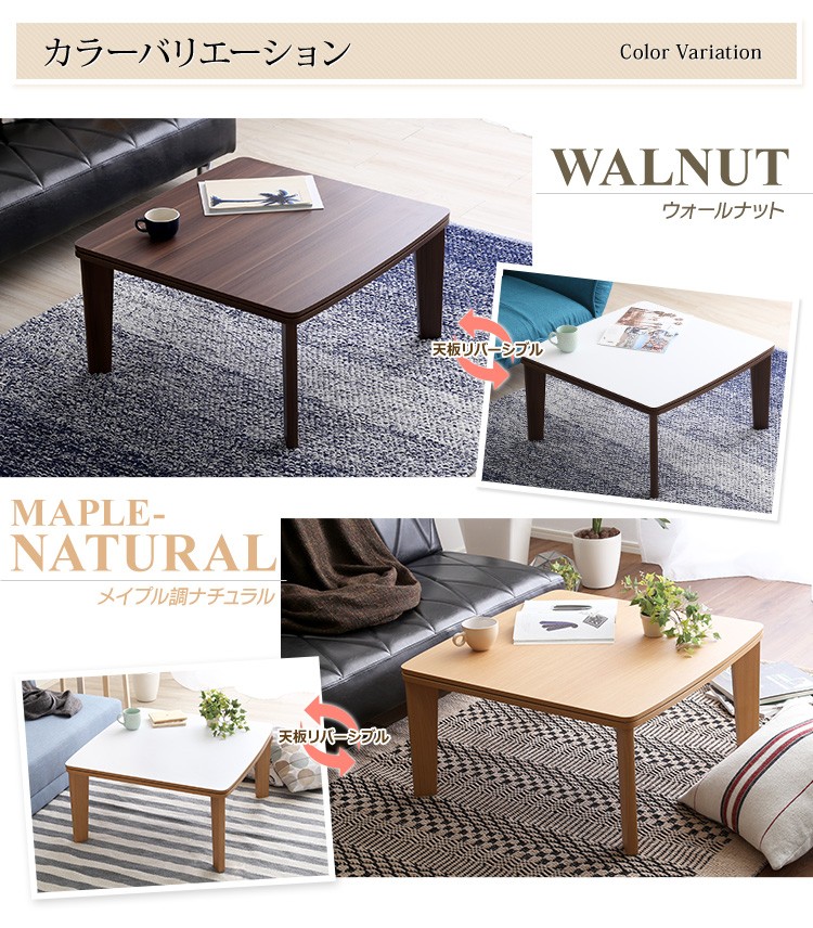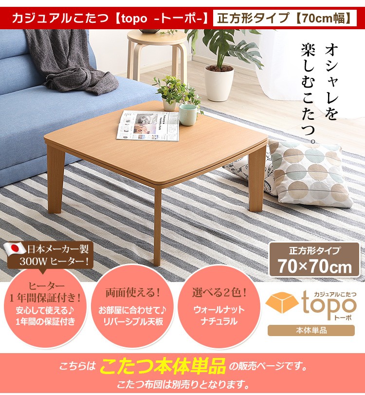 【商品について】カジュアルこたつ【-Topo-トーポ(正方形・70cm幅)】(こたつ 70)■サイズ:本体外寸:(約)幅70x奥行70x高さ35.5cm本体:(約)11.74kg■カラー:本体:ウォールナット、ナチュラル■素材:天板:パーチクルボード、PVCシート脚:MDF、PVCシート※付属品:300Wヒーター(メトロ電気工業株式会社製)・無段階温度調節機能、温度ヒューズ付・スイッチ付き電源コード■その他:・完成品でお届けします。※脚はお客様取付け本体:(約)73.5x73x11cm本体:(約)12.6kg