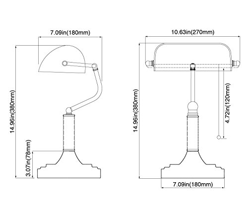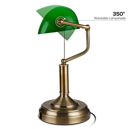 TORCHSTAR Traditional Banker’s Lamp, Antique Style Emerald Green Glass Desk Light Fixture, Satin Brass Finish, Metal Beaded Pull Cord Switch Attached