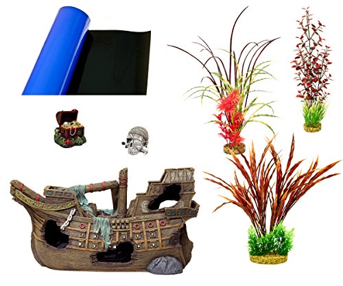 Blue Ribbon 6-Piece Aquarium Ornament Decoration Assortment, Supersize Galleon Pirate Ship Theme