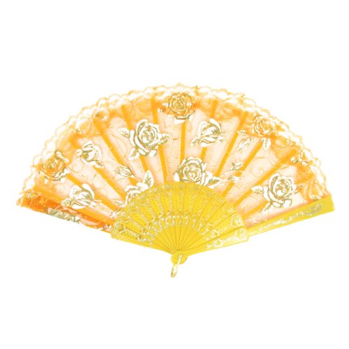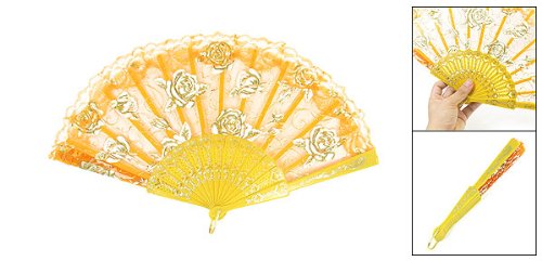 Rose Pattern Plastic Frame Folding Hand Fan Orange Yellow White
