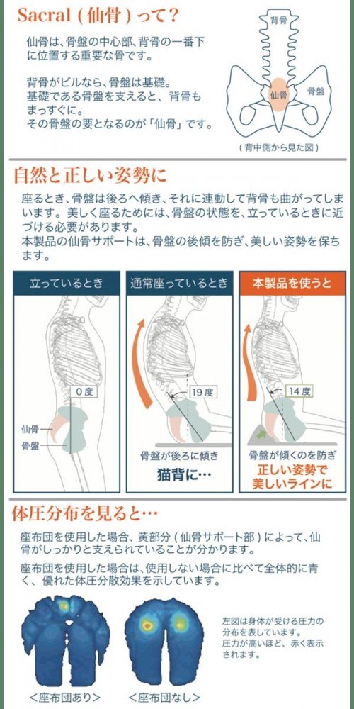 座る時に仙骨(骨盤)を支え、美しい姿勢に導くサポート座布団です。ほとんどの椅子が、座る方にフィットする「オーダーメイドした椅子」のように変わります。デスクワークで長時間椅子に座る方など、椅子に座る全ての方にお薦めいたします。年中使えるリバーシブルタイプ♪ |