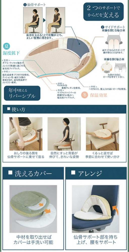| 座る時に仙骨(骨盤)を支え、美しい姿勢に導くサポート座布団です。ほとんどの椅子が、座る方にフィットする「オーダーメイドした椅子」のように変わります。デスクワークで長時間椅子に座る方など、椅子に座る全ての方にお薦めいたします。年中使えるリバーシブルタイプ♪ |