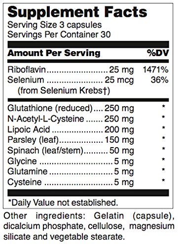 -. Feature : Contain meaningful amounts of antioxidant nutrients including glutathione in its reduced active form, N-acetyl-L-cysteine, a biologically active precursor to intracellular glutathione, alpha-lipoic acid, and selenium. / DOES NOT CONTAIN: This product contains NO yeast, wheat, gluten, soy protein, milk/dairy, corn, sodium, sugar, starch, artificial coloring, preservatives or flavoring. / As a dietary supplement, adults take 3 capsules daily or as directed by physician. / * These statements have not been evaluated by the Food and Drug Administration. This product is not intended to diagnose, treat, cure, or prevent any disease.