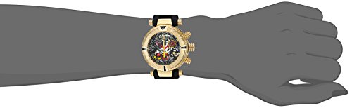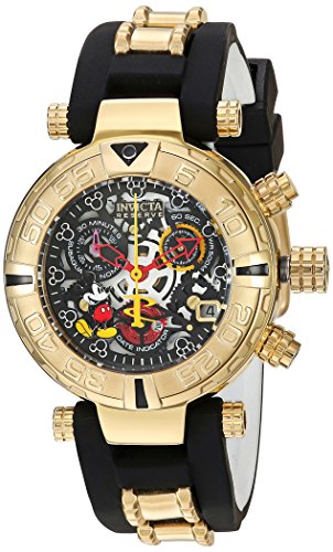 Gunmetal Skeletonized Dial w/Mickey, Red & White Hands & Mickey Mouse Silhouette Hour Markers, Yellow and Red Accents; 18k Gold IP SS Case; Black Silicone Strap w/18k Gold IP Stainless Steel Accents