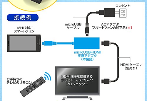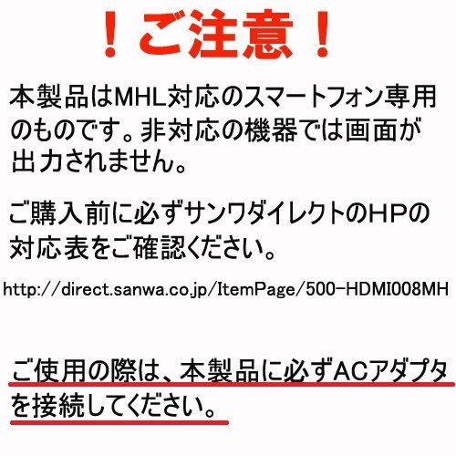 MHL corresponding smartphone USB terminal of the (micro USB) is an adapter that converts the HDMI output terminal. By connecting the MHL compatible smartphone, you can output the video to an HDMI compatible TV or projector (Please be sure to connect the AC adapter to this product when you use ※). Link function (HDMI-CEC function) you can smart phone operations in the corresponding TV in the remote control. (※ Toshiba REGZA link, Sony Bravia link, SHARP AQUOS Fami-link, Panasonic VIERA Link, by Mitsubishi rear links, etc. compatible TV ※ TV, there is a case where the operation function of this product can not be used. ※ in key operations such as typing the content corresponding to the landscape, such as not supported.) photos and videos will be output in landscape orientation. Since the smartphone of the charging port is attached, it provides a stable power even during large HDMI output of the power consumption. Please note: Since the non-correspondence of the model does not output the screen, please be sure to confirm the corresponding model in the Sanwa Direct HP. → http: //direct.sanwa.co.jp/ItemPage/500-HDMI008MH Please note: ※ GALAXY S5 · S4 · SⅢ, I do not correspond to the model with a microUSB compatible 11pin terminal, such as GALAXY NoteⅢ · NoteⅡ series. Also, it can not be used in devices of HDMI output of SlimPort standards such as Nexus7. ※ Please use the things of the AC adapter is always a smart phone genuine to be used for charging. ※ smartphone by AC adapter may not be charged. In addition, it may not be charged by the smart phone. ※ This product is a thing of the correspondence of the smartphone-only MHL. Since the non-correspondence of the model does not output the screen, please be sure to confirm the corresponding model. If the video or audio does not play is ※, there is a case to be solved by cutting the power supply of the smart phone, the restart. ※ output is only full HD. (It does not correspond to the 4K output.) ■ Connector specifications: MicroUSB B connector male - MicroUSB B connector Female / HDMI Female (TypeA female)
