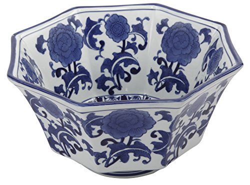 - Crafted ceramic bowl is detailed with an intricate blue and white Floral