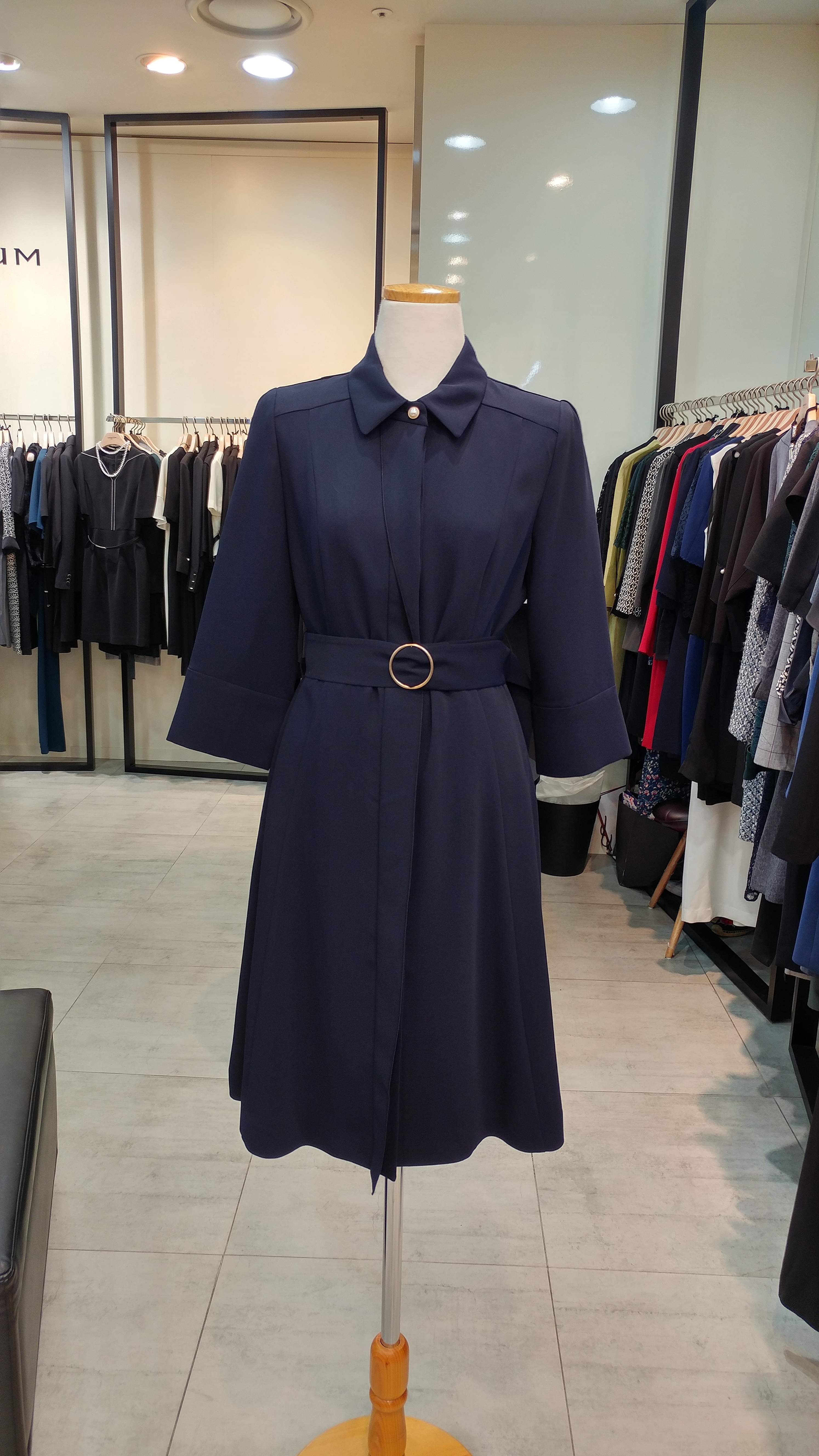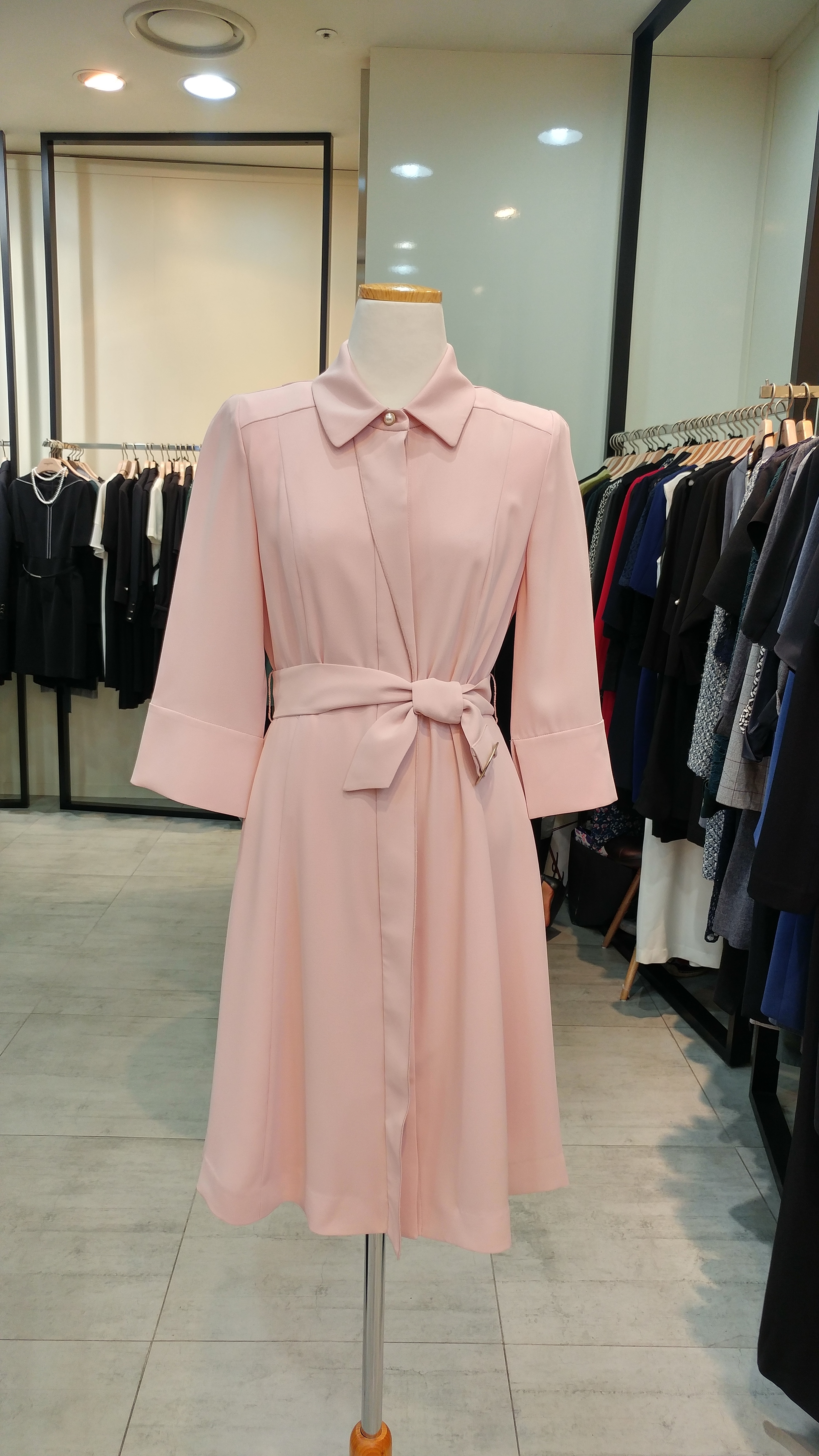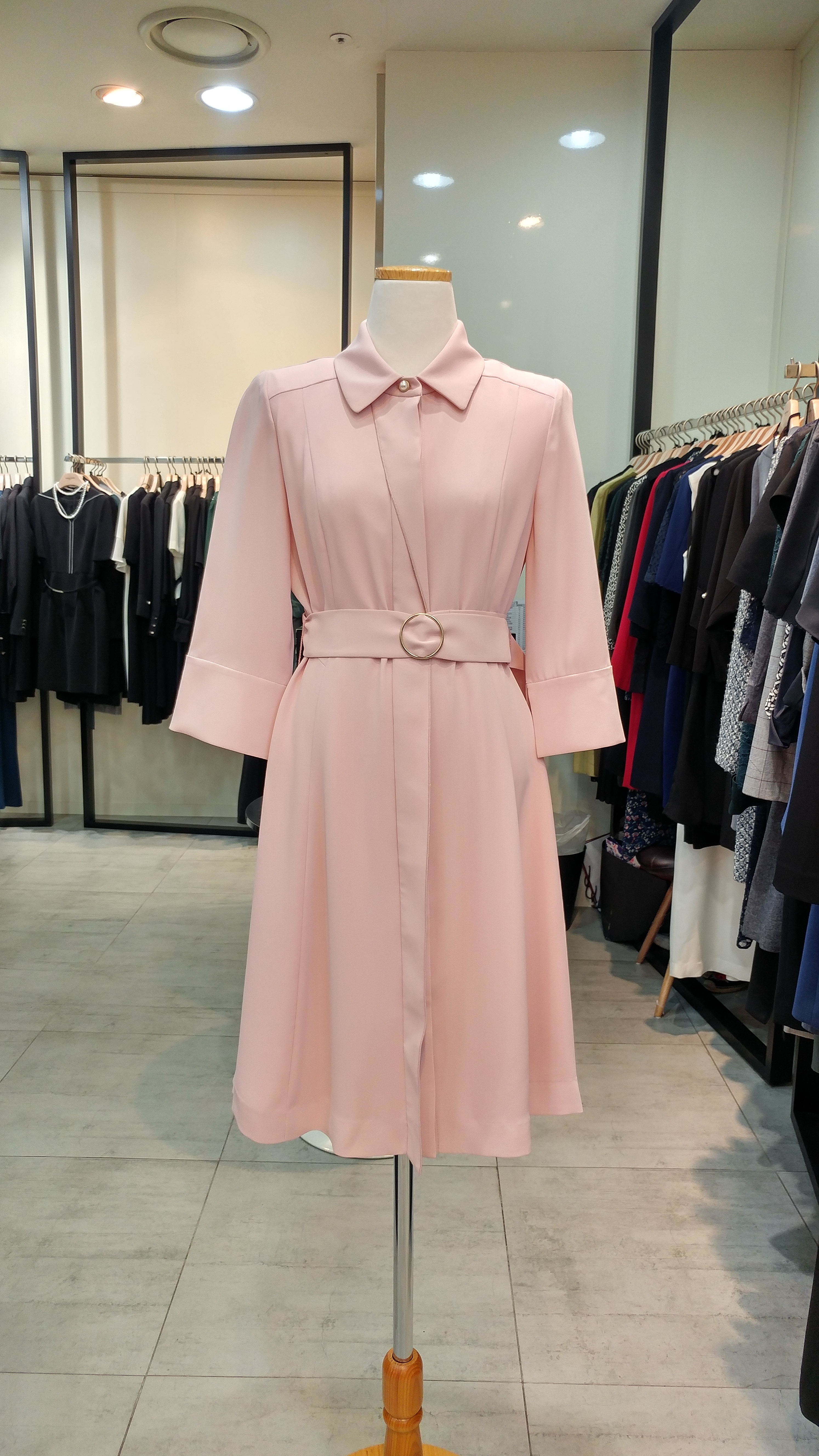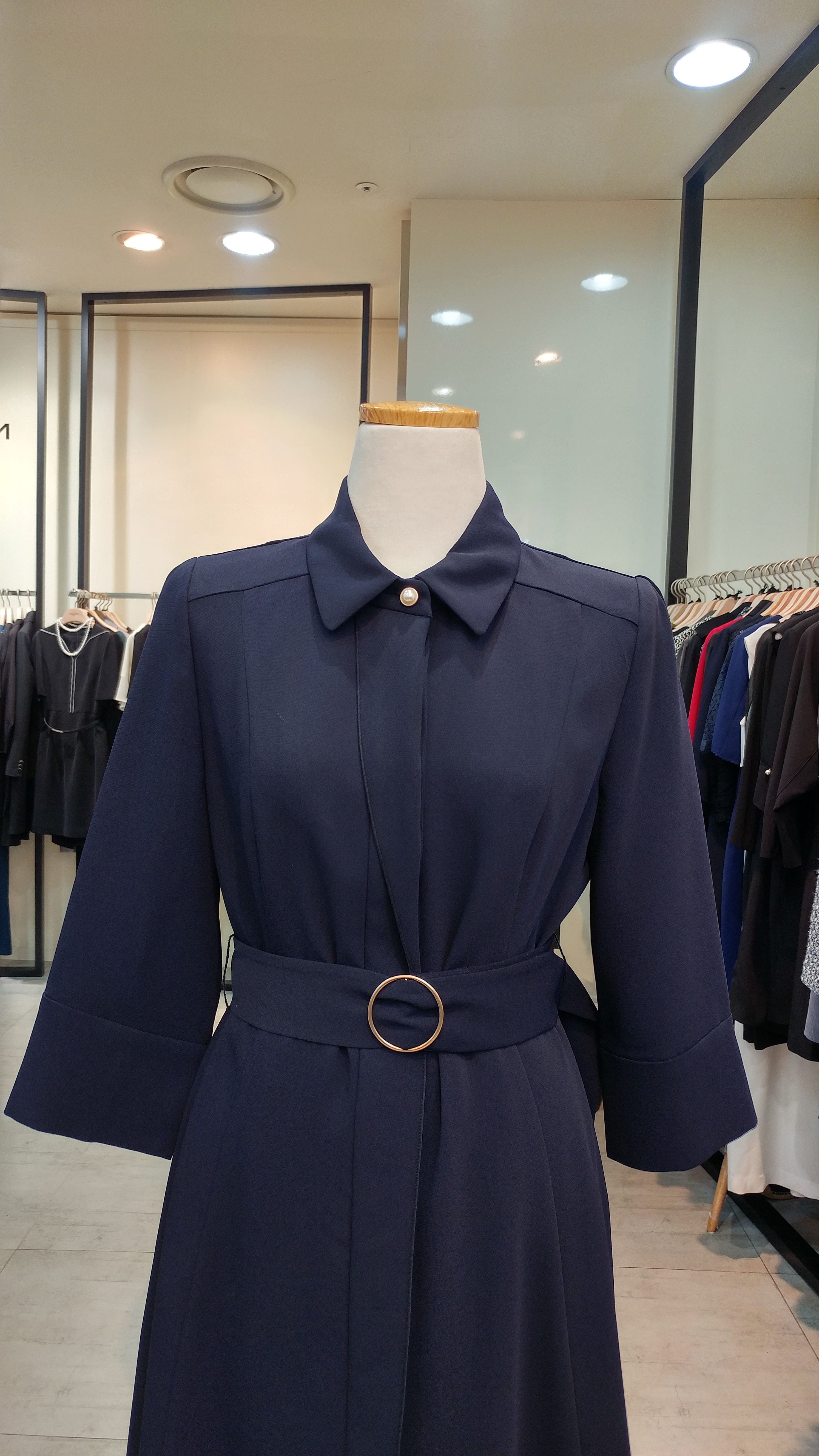 스텐카라A 라인 벨티드 원피스입니다^^  단정  심플하며  고급스러움과 여성스러움 이 돋보이는 스타일^^총장92