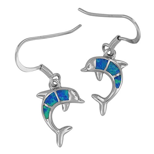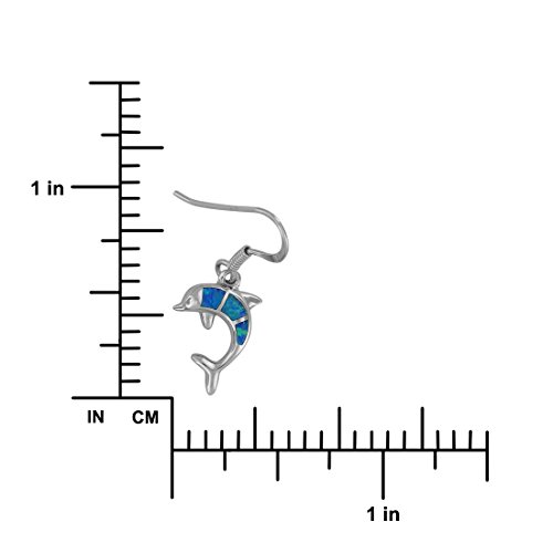 Dolphin dangle earrings with beautiful aqua colored synthetic opal inlay. Earring measures 9/16 inch (0.56 inch) tall and 7/16 inch (0.44 inch) wide. High polished for easy care and rhodium plated sterling silver for superior quality and shine as well as anti-tarnish properties.