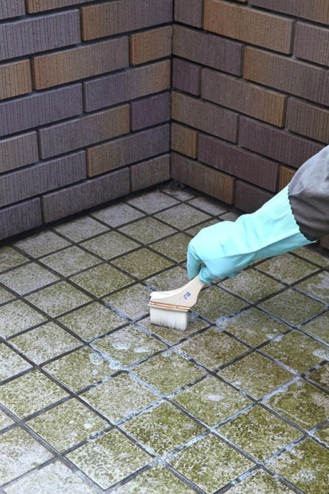 【使い方】 洗浄前に、ハケ・洗浄液を移し替える容器、洗浄用タワシ又はナイロンタワシを用意ください。 1.洗浄液がついて困る部分はシートなどで養生し、洗浄箇所に予め水を散布し、湿らせておきます。 2.用意した容器に洗浄液を移し替え洗浄面にハケで洗浄液をタップリ塗布します。 ※直接かけたり、スプレー容器に移しての使用はおやめください。目より高い位置に使用する場合、飛散に充分注意し、ゴーグルなど保護メガネ(プラスチック製)を使用下さい。 3.約10分程度放置し(30分以上放置しない)ポリ製手袋など水をはじく手袋をして、タワシ又はナイロンタワシで擦ります。 ※デッキブラシでのブラッシングは洗浄液の飛びはねがありますので使用はお控え下さい。 4.使用後はホースを使い洗浄液の泡立ちがなくなるまで、充分水洗いしてください。 ※洗浄不足の場合乾燥後、洗浄面が白く残ります。この場合再度水洗いしてください。 5.ガンコな汚れは上記作業をくり返してください。 ※必ず単独で使用する。特に塩素系の製品と一緒に又は混ぜて使わない。 |