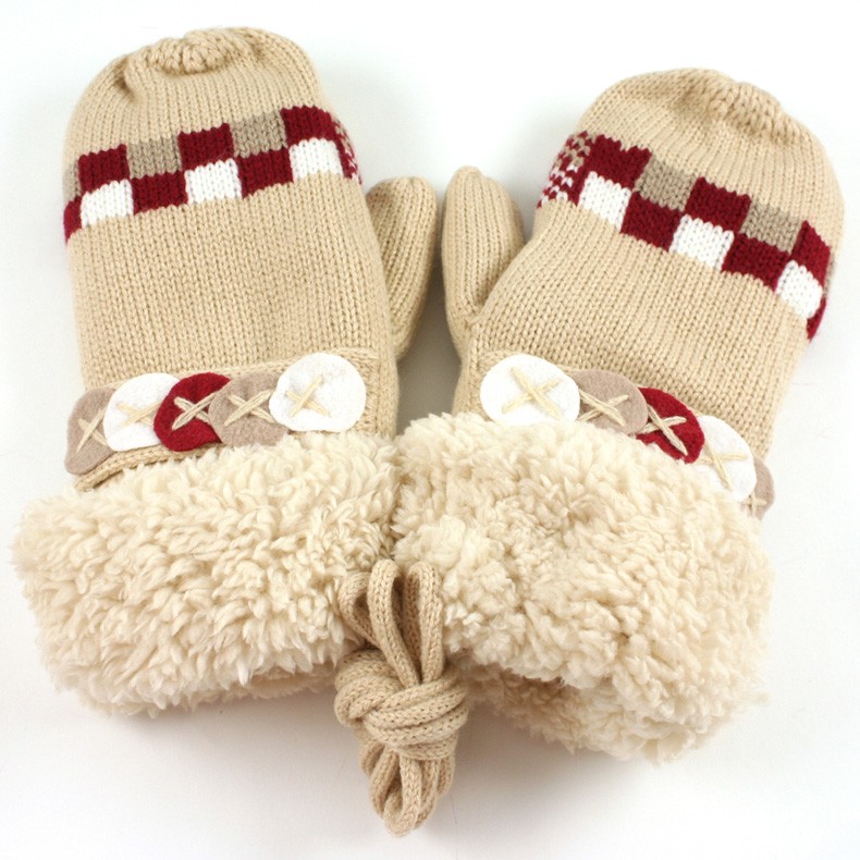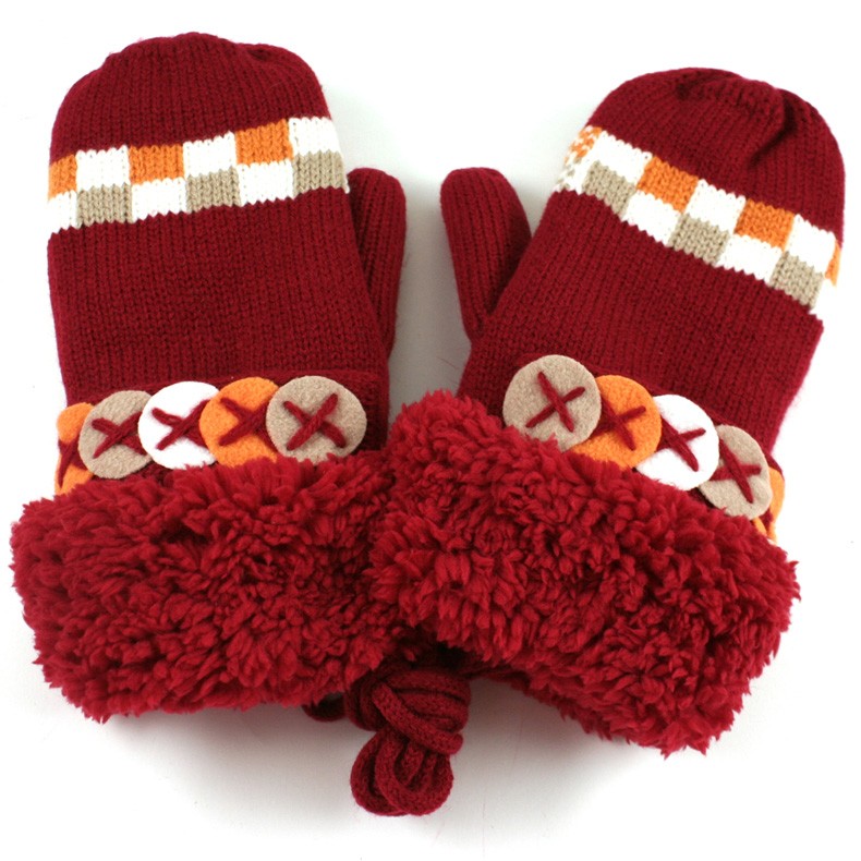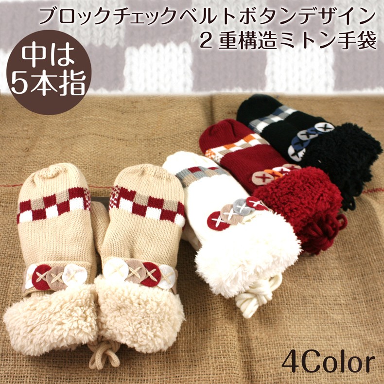 【メール便不可】ボタンがデザインされたお洒落なニット×ボア手袋の登場です☆★☆中は全面ファー素材なのでとっても暖か◎5本指に分かれている作りになっているので、通常のミトンより暖かく、物が持ちやすいですよ☆便利な首紐つきです☆通勤・通学に欠かせない存在になりそうですね!!自分用にはもちろん、誕生日プレゼントやクリスマスプレゼントにもオススメですよ☆ラッピングもできます(¥315)☆ブラック、レッド、ホワイト、ベージュの4色展開です♪■サイズ:フリー■素材:アクリル■全長:約23cm