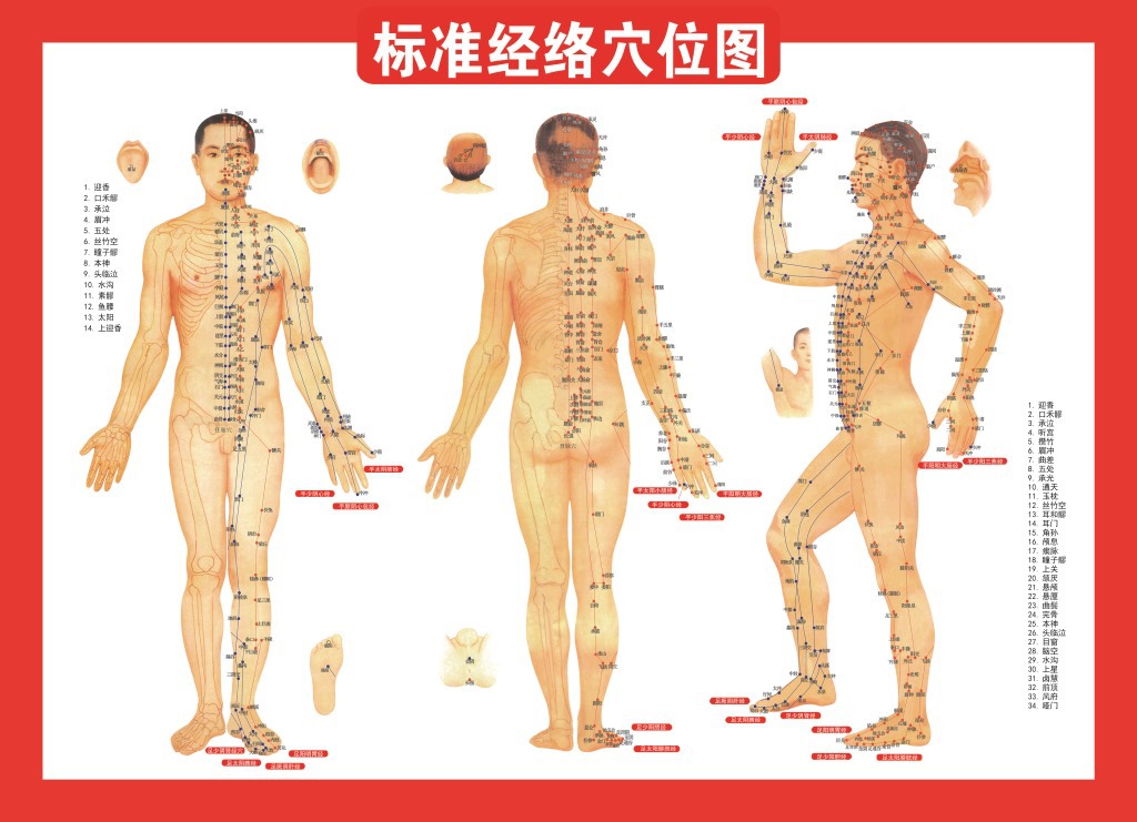 正面是《标准经穴部位图》,背面附《施灸取穴参考表》、《常用体穴参照表》、《四穴养生法》......等