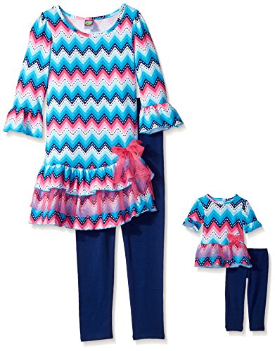 Short sleeve chevron knit drop waist tiered tunic with bow detail at waist. Knit legging. Comes with matching doll garment