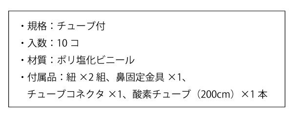 ●付属品:紐×2組、鼻固定金具×1、チューブコネクタ×1、酸素チューブ(200cm)×1本