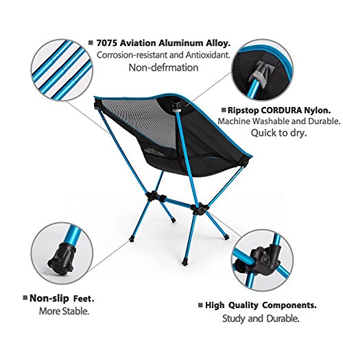 Heavy Duty. Aircraft-grade 7075 Aviation Aluminum Alloy is one of the highest strength aluminum alloys, Light Quality , Heavy Duty. Non-slip rubber covers on the feet ensure a firm stand. Our sturdy and durable chair has a load capacity of up to 250 pounds. More interestingly, you can throw it to your friend if you need.camping chairs camping table chair collapsib