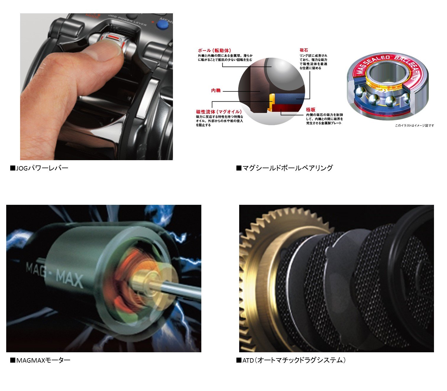 "Mag Shield Ball Bearing" waterproof and durable technology which blocks initial penetration of sea water and foreign matter and keeps initial performance long, "Mag Shield Ball Bearing" of High Power & High Speed "MAGMAX Motor" to the "JOG power lever" which can operate comfortably with one hand