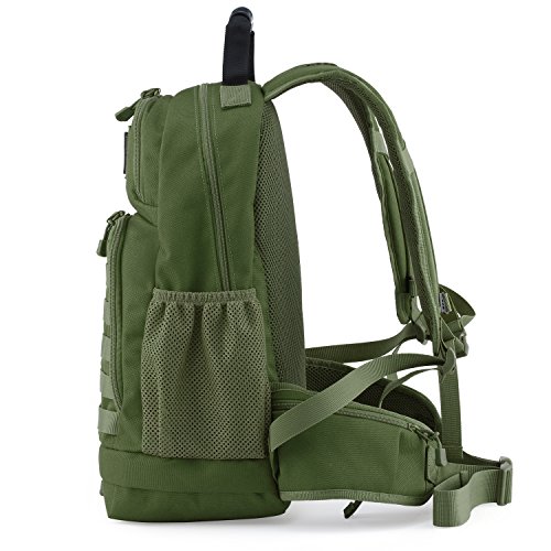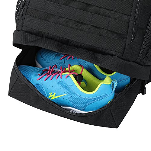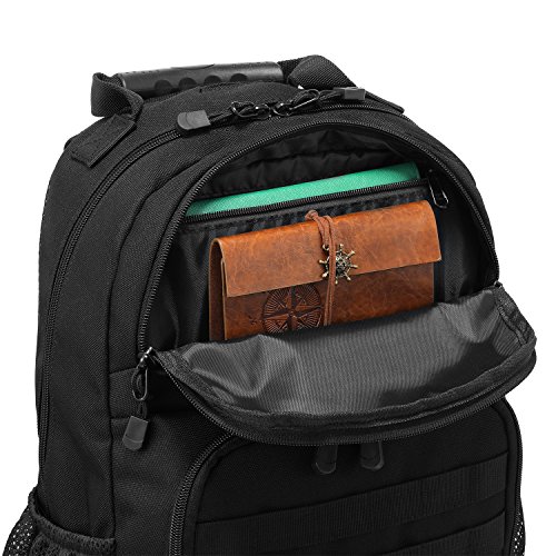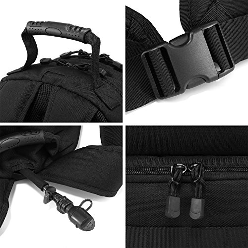 -. Feature : DURABLE & WATER RESISTANT- Our backpack is made from high-density 900D fabric, which is stick and water resistant. It is equipped with smooth double zipper selected from military SBS zipper. / ORGANIZED- The roomy main compartment contains 2 interlayers for laptop and iPad. 2 front pockets with dual zippers help you carry more scattered items. Bottom pocket is about 3.6L, it is for less used items such as umbrella, spare clothes. 2 waist pockets are easy to access to your iPhone Plus. The hydration system can help you use hydration bladder easily. / FUNCTIONAL- Its multiple zipper pockets design will help you store all items properly on any occasion. So this backpack is perfect to use as tactical backpack, trekking backpack, daypack, travel backpack etc. / ADJUSTABLE- Shoulder straps, waist straps and chest straps are adjustable to make the backpack fit you well. Dimension: 18.5 x 11 x 6.5inches. Capacity: 25L. It is really a lightweight backpack which weights 1.9 lbs. / MOLLE SYSTEM- MOLLE external expansion system is designed to combine with other equipment. You can load pouches, water bottle bag, accessory kits and others.