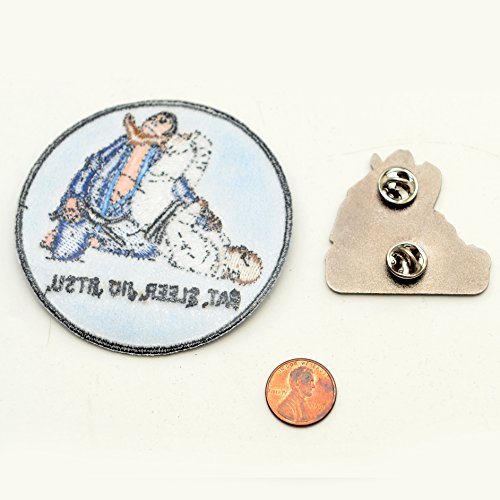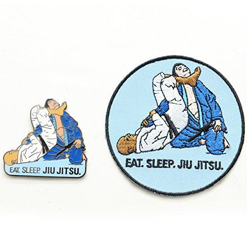 Binding : Apparel Product Description Finally a brazilian jiu jitsu pin and patch for all you BJJ lovers. Great accessories to your fight mma gear. Both the patch and the pin read EAT. SLEEP. JIU JITSU on them. They feature two men in traditional gi rolling with each other. The hard enamel pin is 1.75." The Iron on patch has a 3" circumference. 0