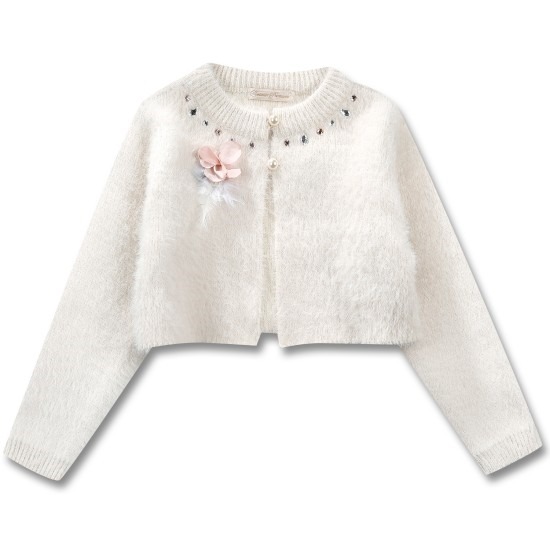 따뜻한 느낌을 주는 겨울 가디건 입니다.코사지와 비즈장식이 돋보이는 제품입니다.