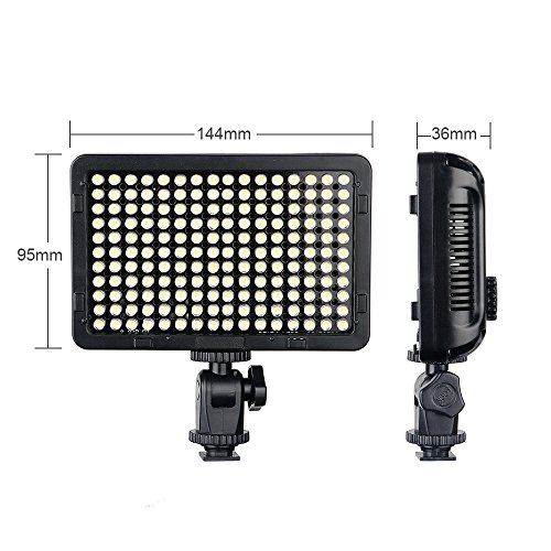 - Feature : Small and Slim, Light Size is 144*95*36mm/5.67*3.74*1.42in. High Output Power at 11W, Luminous Flux: 1320LM. / Built in with over heat protection and high power fan, suitable for wide range voltage, Average Lifespan ≥50000 hour. / Adopts latest strong Anti-Jamming CPU, which makes the circuit more simple, the controlling statistics stable and improves the consistency. / Integrated cold shoe with locking ring and 1/4" thread inside, easy to be mounted on tripods or any other devices with 1/4" screws. / 2 filters included with Spotlight effect, Diffuse effect, and for reducing the color temperature to 3200K.