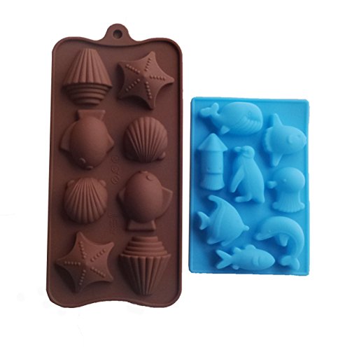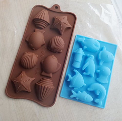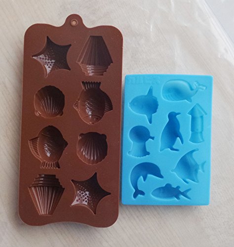 Yunko 8 Cavity Ocean Chocolate Silicone Mold Ice Cube Candy Mould Fudge Mold 2 Pcs /Set Dolphin Whale Squid Penguin Shell