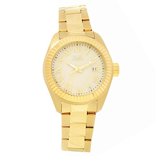 Gold-plated stainless steel case and bracelet. Fixed gold-plated bezel. Champagne dial with luminous gold-tone hands and Roman numeral hour markers. Minute markers around the outer rim. Dial Type: Analog. Luminescent hands and markers. Date display at the 3 o'clock position. Quartz movement. Scratch resistant flame fusion crystal. Pull / push crown. Solid case back. Case diameter: 40 mm. Round case shape. Band width: 20 mm. Band length: 7.67 inches. Fold over clasp with safety release. Water resistant at 100 meters / 330 feet. Functions: date, hour, minute, second. Casual watch style. Invicta Angel Champagne Dial Gold-plated Ladies Watch 20316.Feature