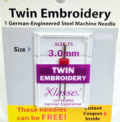 -. Feature : Klasse Twin Embroidery 1 Pack (A5-15830) / Description: Klassé Twin Embroidery Needle - 3.0 mm/Size 75 1/pkg. / Used for heirloom sewing and decorative top stitching. 1st size indicates space between needles.
