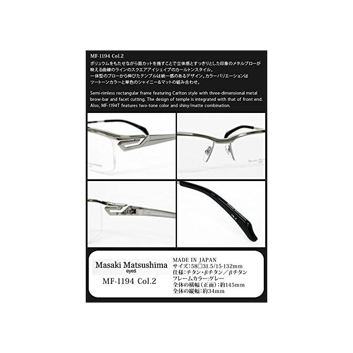 원본상품명:(マサキマツシマ)薄型非球面レンズ付 Masaki Matsushima MF-1194 Col.2(グレ)レンズ付メガネセット(度付き)