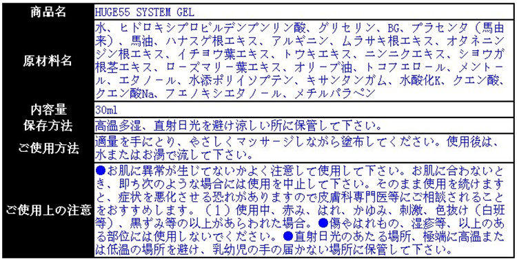 成分:水,羟基专业建设淀粉磷酸酯,甘油,BG,胎盘(马衍生),马油,知母根提取物,精氨酸,紫根提取物,亚洲人参提取物,银杏叶提取物,当归提取物,大蒜提取物,生姜提取物,迷迭香叶提取物,橄榄油,生育酚,薄荷醇,乙醇,氢化Poriisoputen,黄原胶,氢氧化钾,柠檬酸,柠檬酸钠,苯氧乙醇,Mechiruparapen。