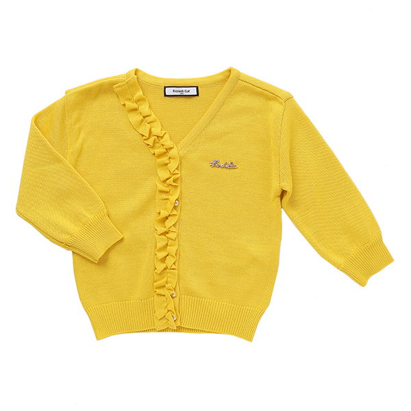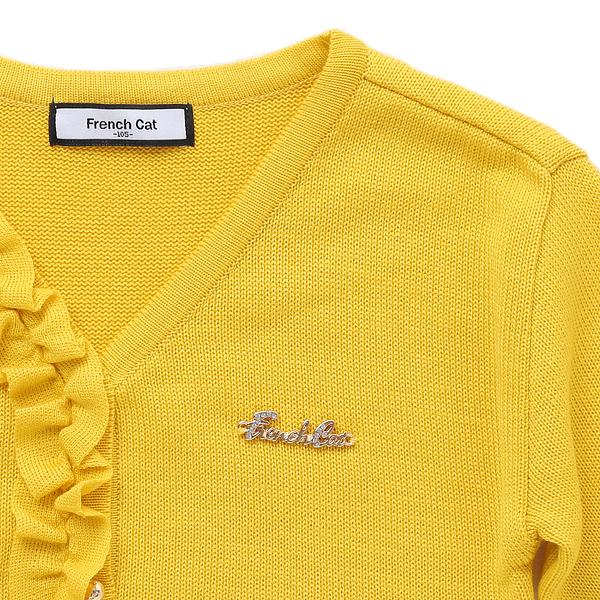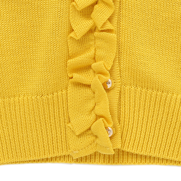 상품설명 노랑 프릴 가디건입니다. 머스타드에 가까운 컬러감이 깊이 있어 보이는데요. V넥 라인에 골드볼 단추로 레트로한 감성까지 엿볼수 있는 제품입니다.
