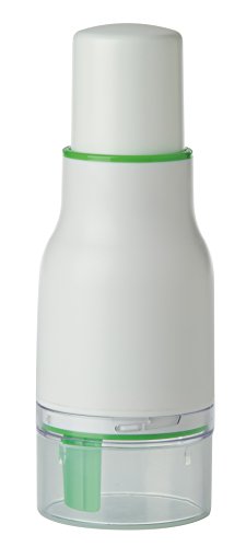 -. Feature : Hand food chopper with removable cup; precisely chop herbs, garlic, nuts and more in seconds / Stainless steel blades rotate while chopping for even results / Built-In wiper rotates with each chop to remove food build up on the container walls / Chops directly on cutting board or in the removable cup for less countertop mess / Measures 7" high by 2.5" Diameter ; dishwasher safe