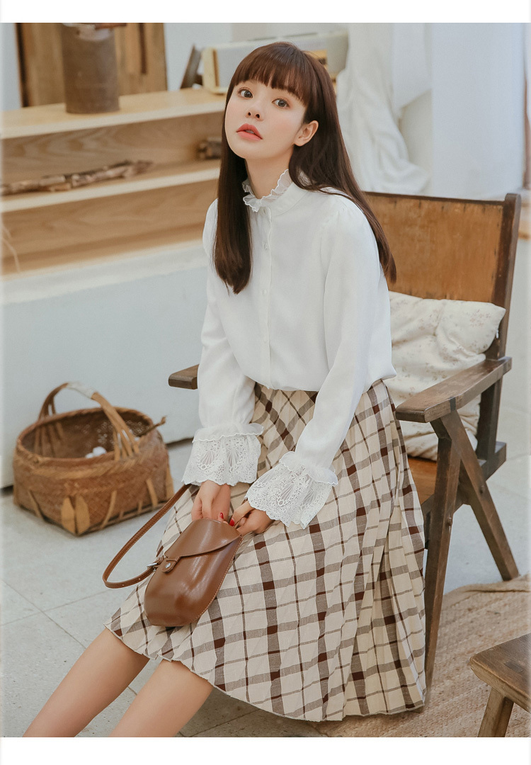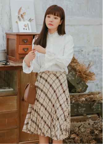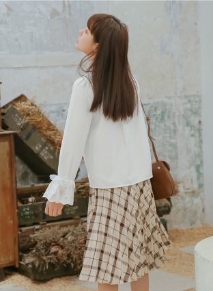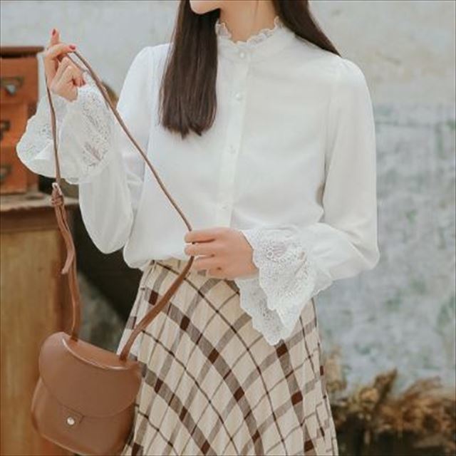襟元と袖口のレースがフェミニンさあふれるシフォンブラウスのご紹介です。