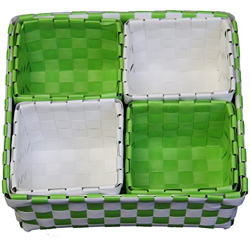- Set of 5 straw weave green/white checkered pattern baskets for open storage