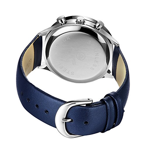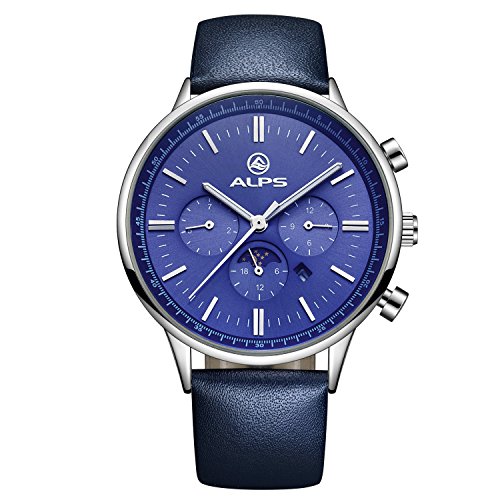 -. Feature : Brand: ALPS / HIGH QUALITY precise Japanese-quartz movement: provide precise and accurate time keeping / LUXURY DRESS WATCH : multi-dials with calendar/ moonphase display, Stainless steel case, a dress/business watch / WATERPROOF :98FT / 30M Water Resistant - 5ATM: Daily Use Waterproof, Hand Wash, Shower, Swimming (Please DONOT PULL OUT the button under water) / COMFORTABLE and SOFT BAND : Blue genuine leather band