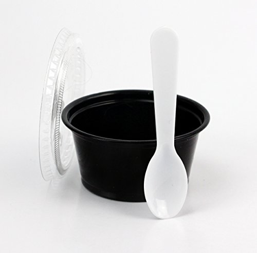 Disposable Black 2oz Plastic Condiment Cups with Lids and 3" Sampling Spoons, Souffle Portion, Jello Shot Cups, Dessert, Sample Cups (100 Count, White Tasting Spoons)