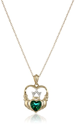 -. Binding : Jewelry -. Brand : Amazon Collection -. Department : womens -. Feature : Yellow gold necklace with claddagh pendant featuring bezel-set heart-shape emerald and diamond-studded crown / 18" rope chain with sP.R.Ing-ring clasp / The natural properties and composition of mined gemstones define the unique beauty of each piece. The image may show slight differences to the actual stone in color and texture. / Gemstones may have been treated to improve their appearance or durability and may require special care. / All our diamond suppliers confirm that they comply with the Kimberley Process to ensure that their diamonds are conflict free. / Imported -. Label : Amazon Curated Collection -. Manufacturer : Amazon Curated Collection -. Model : Z58903CE2CAM -. MPN : Z589053PCECH -. PartNumber : Z589053PCECH -. ProductGroup : Jewelry -. ProductTypeName : FINENECKLACEBRACELETANKLET -. Publisher : Amazon Curated Collection -. Studio : Amazon Curated Collection -. Title : 14k Yellow Gold Created Emerald and Diamond Claddagh Pendant Necklace