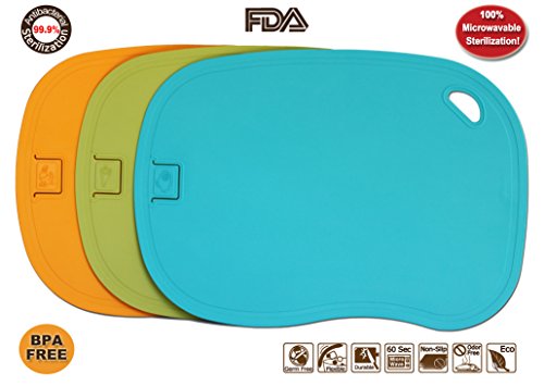 - Feature : 100% MICROWAVABLE STERILIZATION! - GERM FREE IN 60 SECONDS! - Just fold, lock in tab, place in microwave. Never Seen Before! This chopping board does it all! - Never need another chopping block! / 99.9% ANTIMICROBIAL! - This cutting board contains a natural compound found in trees and plants that prevents bacteria growth. / PREPARE YOUR FOODS in the Safest way possible! BPA Free & FDA Approved! Backed by a 30 Day Money Back Guarantee! / CONVENIENT JUICE GROOVE reduces leakage - Excellent elimination of unpleasant odor and bacteria - Flexible design for easy pouring of chopped food - Elasticity prevents blade scars and knife damage. / DISHWASHER SAFE - Icon & Color Coded to Avoid Cross Contamination - Embedded Holes for Hanging - Non-Slip - Scratch Resistant - Odor Resistant - 100% Recyclable - BPA Free - FDA Approved. Great Gifts for Moms, Dads, Weddings, Anniversary, Birthday, Christmas, Holidays!