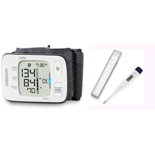 -. Binding : Health and Beauty -. Brand : Omron -. EAN : 0045625046873 -. Feature : No. 1 Doctor and Pharmacist Recommended Brand / Tested and validated for accuracy the same as all Omron upper arm blood pressure monitors / Heart Zone Guidance helps ensure consistently accurate readings by activating the monitor when your wrist is at heart level / Irregular Heartbeat Detector alerts you of irregular heartbeats while your blood pressure is being taken; also features Ultra Silent Inflation, Blood Pressure Level Indicator Bar and Advanced Averaging / 100 Memory Storage with date and time stamp allows you to review readings with the touch of a button -. IsAdultProduct : 0 -. Label : Omron -. Manufacturer : Omron -. MPN : BP652N -. PackageQuantity : 1 -. PartNumber : BP652N -. ProductGroup : Health and Beauty -. ProductTypeName : HEALTH_PERSONAL_CARE -. Publisher : Omron -. Studio : Omron -. Title : Omron BP652N 7 Series Wrist Blood Pressure Monitor with Thermometer -. UPC : 045625046873